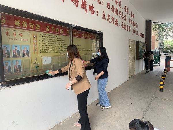 院內(nèi)整理清掃完畢后,大家又轉(zhuǎn)移陣地到辦公樓內(nèi),對辦公室、廁所、樓道等區(qū)域進(jìn)行了打掃。黨員們充分發(fā)揚“甩開膀子、挑起擔(dān)子”的精神,擦拭玻璃、打掃地面、清理垃圾,全方位消毒噴殺,每一步都認(rèn)真到位,不留死角。經(jīng)過近三個小時的辛勤勞動,院里綠化帶的枯枝、雜草得到了整治,機關(guān)大院內(nèi)更加整潔美觀,環(huán)境煥然一新。機關(guān)辦公室窗明幾凈、一塵不染,所有衛(wèi)生死角被徹底清理。大家擦擦汗水,露出會心的微笑。