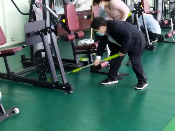 參與活動的20余名同志,分工合作,雖然大家來自不同部門、不同崗位,但爭先恐后、合作默契,清理地面、擦拭健身器材、清潔桌凳?!扒懊娴哪型緜兗佑土?,我們快趕上你們了!”負責拖地的九分公司主任經濟師劉彩在后面說道。“這個乒乓球擋布拿抹布擦拭的效果不太好,用外面的高壓水槍沖洗試試吧!”九分公司主任會計師付世芳一邊用抹布擦拭擋布一邊提出自己的合理化建議,“這個辦法好!”九分公司綜合辦公室主任張路平同意道。