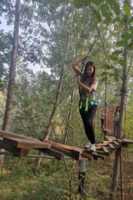 “叢林穿越”項目最受大家歡迎,有空中秋千、索道、走鋼絲、獨木橋、空中云梯、吊橋等一系列的拓展環(huán)節(jié)。叢林穿越過程中,劉暢作為今年新入職的職工,第一個走上了獨木橋的平臺上,只見她的雙手緊緊地抓住兩邊的繩子,目光堅定,腳步穩(wěn)健,順利完成了第一個挑戰(zhàn)項目——獨木橋。隨后,來到走鋼絲的環(huán)節(jié),只見她小心翼翼試了試腳感,感覺比較安全,然后小碎步開始向前走。突然,鋼絲像秋千似的蕩起來,于是她就改變了策略,邁開大步向前走,本來晃動挺厲害的鋼絲慢慢靜止下來,找到了最佳的方法后,還不忘向后面的同事傳授闖關秘籍,最后在她不懈的努力下闖關成功。就在大家紛紛踴躍嘗試拓展項目的過程中,發(fā)生了一個令人感動的小插曲。機關后勤人員桂淑霞在闖空中云梯環(huán)節(jié)中,由于體力不支,突然她的雙腿從梯子的空隙中跌落下去,卡在梯子中,動彈不得。正在后面闖關的財務科科長宋敬凱看到了這一幕,他不顧自己的安危,飛快跑過去,幫桂淑霞把雙腿從空隙中“拔”了出來,使她脫離險境。