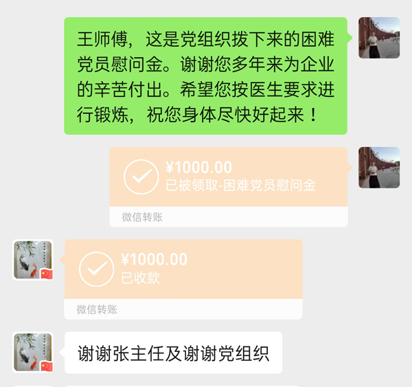 “現(xiàn)在身體怎么樣?生活可有什么困難?”因受疫情影響,不能對所有困難黨員和困難職工實現(xiàn)入戶走訪,公司黨委和工會就通過電話一一聯(lián)系,仔細(xì)詢問他們疫情防控期間生活情況、身體健康狀況,根據(jù)他們的實際情況,將慰問金通過微信轉(zhuǎn)賬發(fā)給個人,米面油等慰問品能送到小區(qū)門口的送到小區(qū)門口,能送到工地的送到工地。