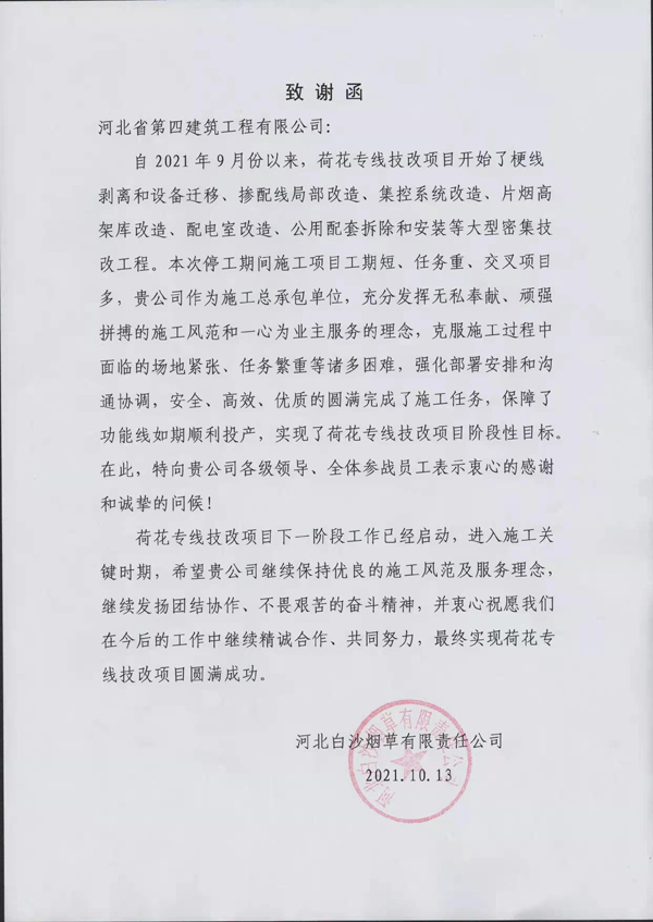 一紙致謝函,字字鼓人心!10月13日,三分公司中煙項(xiàng)目部收到業(yè)主河北白沙煙草有限責(zé)任公司發(fā)來的致謝函,感謝項(xiàng)目部克服場地緊張、任務(wù)重等諸多困難,圓滿完成施工任務(wù),實(shí)現(xiàn)了荷花專線技改項(xiàng)目階段性目標(biāo)。