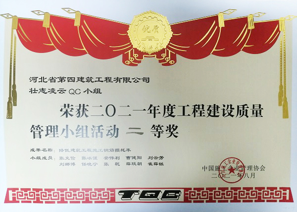 10月中旬,公司收到中國施工企業(yè)管理協(xié)會《關(guān)于公布2021年工程建設(shè)優(yōu)秀質(zhì)量管理小組的通知》,在中國施工企業(yè)管理協(xié)會工程建設(shè)質(zhì)量管理競賽中,七分公司壯志凌云QC小組經(jīng)過初賽、復(fù)賽、決賽三個(gè)階段比拼,最終榮獲二等獎。