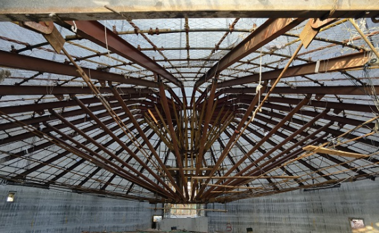 體系設(shè)計(jì)優(yōu)化,拼裝提速?!颁摻罨炷镣矀}(cāng)錐殼頂板架空支撐施工工法”依托糧食類(lèi)筒倉(cāng)工程,筒倉(cāng)建筑高度高達(dá)50米,內(nèi)徑26米,倉(cāng)頂設(shè)計(jì)為錐殼頂、平頂雙層結(jié)構(gòu),斜錐殼板厚0.2米。以往筒倉(cāng)倉(cāng)壁一般采用滑模施工,錐殼頂板施工復(fù)雜,一般采用H型鋼組裝成圓柱形核心筒、外輻射鋼桁架平梁的方式組裝成支撐平臺(tái),重21.9噸,用鋼量大,制作成本高;節(jié)點(diǎn)連接采用焊接,拼裝速度慢,無(wú)法滿(mǎn)足群體筒倉(cāng)的周轉(zhuǎn)時(shí)效。分公司針對(duì)傳統(tǒng)做法的弊端,組織科研小組,專(zhuān)項(xiàng)研究,破解難題,最終形成了空間鋼桁架——拉索組合結(jié)構(gòu)支撐體系。該體系摒棄了3.2米直徑的圓柱型核心筒,采用直徑2.6米的傘狀中心筒,通過(guò)五道環(huán)梁環(huán)向拉接,無(wú)需設(shè)置斜撐,原結(jié)構(gòu)減輕將近1噸,節(jié)約了制作成本,而且承壓能力更強(qiáng)。重點(diǎn)節(jié)點(diǎn)還改用了高強(qiáng)螺栓連接代替焊接,拼裝速度明顯提升,施工速度更快。