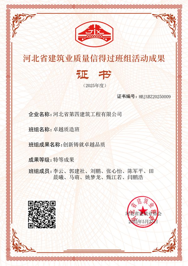 5月25日,三分公司收到河北省建筑業(yè)協(xié)會關(guān)于2025年度河北省建筑業(yè)質(zhì)量信得過班組活動結(jié)果的通報,由分公司“卓越質(zhì)造班”班組完成的“創(chuàng)新鑄就卓越品質(zhì)”成果,被評為“特等成果”。