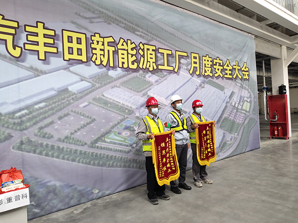 會(huì)上,業(yè)主對(duì)所有參建單位自開工以來的安全管理情況進(jìn)行了總結(jié),對(duì)兩家先進(jìn)集體和兩名先進(jìn)個(gè)人進(jìn)行了表彰。天津一汽樹脂車間項(xiàng)目部由于規(guī)范嚴(yán)謹(jǐn)?shù)墓芾?,在眾多施工單位中脫穎而出,榮獲“五月份安全施工模范單位”錦旗;項(xiàng)目安全員王喜峰榮獲“優(yōu)秀安全員”榮譽(yù)稱號(hào)。日方課長(zhǎng)督查佐藤和一汽豐田汽車總部副總經(jīng)理相馬清親對(duì)天津一汽新能源工廠項(xiàng)目部安全工作給予了表彰,項(xiàng)目經(jīng)理苗建偉在會(huì)上做交流發(fā)言,介紹了項(xiàng)目施工安全管理經(jīng)驗(yàn)。