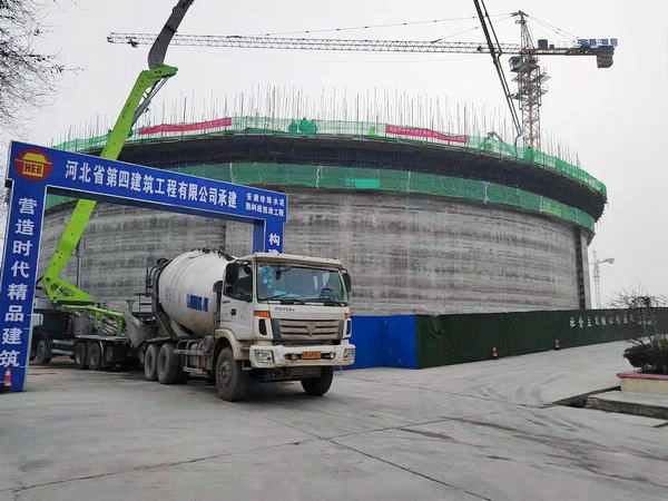 熟料儲(chǔ)存及輸送筒倉直徑60米,高20.5米。1月11日,業(yè)主項(xiàng)目負(fù)責(zé)人王利杰組織召開專題會(huì)議,鄭重要求1月20日前滑模施工必須完成。面對業(yè)主早日投產(chǎn)的殷切期盼,項(xiàng)目部緊急組織施工策劃,明確搶進(jìn)度措施辦法,全體動(dòng)員,多點(diǎn)發(fā)力,全力以赴保滑模施工。在動(dòng)員會(huì)上,成立了以項(xiàng)目經(jīng)理為組長的滑模領(lǐng)導(dǎo)小組,班子帶班,明確責(zé)任目標(biāo);與作業(yè)班組簽訂安全、質(zhì)量承諾書,增強(qiáng)其責(zé)任意識;購置鋼筋間距測量設(shè)備,節(jié)省驗(yàn)收鋼筋工程時(shí)間和人力。由于疫情原因,現(xiàn)場勞力不能迅速到位,項(xiàng)目部提前組織管理人員晚上加班吊運(yùn)鋼筋、水泥、腳手板等材料,大家高漲的干勁兒在滑?,F(xiàn)場起到了積極的帶動(dòng)作用。庫壁預(yù)應(yīng)力鋼絞線設(shè)置較為密集,每間隔26厘米一道,而且?guī)в腥嵝?,往庫壁鋼筋?nèi)穿設(shè)時(shí)容易跑偏,工作效率低。為加快施工,技術(shù)人員巧妙地在庫壁鋼筋上加設(shè)了U型鋼筋固定鋼絞線穿行位置,然后大家一字排開,“一二、一二……”齊聲喊著口號,有節(jié)奏地用力將鋼絞線在庫壁鋼筋里穿行直到扶壁柱。數(shù)九隆冬的夜間滑模平臺(tái)上氣溫很低,但是大家的工作熱情不減,干勁不退,抬鋼筋、綁鋼筋、穿鋼絞線……,干得熱火朝天,沒有人叫苦喊累,在大家的共同努力下,滑模以每天2.7米的速度快速推進(jìn)。