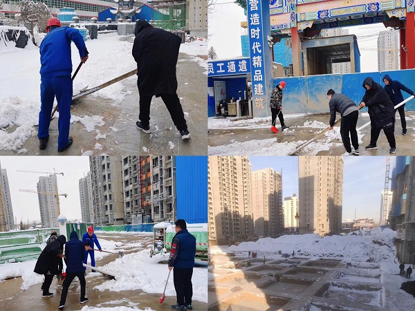 由于本輪低溫降雪持續(xù)時(shí)間較長(zhǎng),整個(gè)施工現(xiàn)場(chǎng)積雪不僅厚還很瓷實(shí),清掃工作十分困難。寒風(fēng)凜冽刺骨,但大家熱情高漲,充分發(fā)揚(yáng)不怕苦、不怕累的精神,黨員干部帶頭,職工群眾踴躍參加,按照分工好的清掃區(qū)域全面鋪開(kāi)進(jìn)行。設(shè)備管理員系上安全帶爬上塔吊,清理積雪,先后對(duì)各類(lèi)機(jī)械設(shè)備進(jìn)行維修保養(yǎng),檢查是否存在安全隱患;電工按照巡檢路線展開(kāi)防寒防凍措施檢查,并對(duì)臨電周邊積雪進(jìn)行清理;其他管理人員掃的掃、鏟的鏟、相互配合,清除辦公區(qū)及生活區(qū)積雪;在施工區(qū)域,各分包隊(duì)伍清理道路積雪,對(duì)1#、2#、6#、10#住宅樓各層采取冬季保暖措施,并對(duì)門(mén)窗逐個(gè)進(jìn)行封閉;項(xiàng)目經(jīng)理帶隊(duì),加強(qiáng)現(xiàn)場(chǎng)巡護(hù),落實(shí)落細(xì)各項(xiàng)安全措施,確保雪后順利復(fù)工。經(jīng)過(guò)大家一個(gè)上午的通力合作,高質(zhì)高效地完成了掃雪除冰工作,確保重點(diǎn)區(qū)域沒(méi)有積雪結(jié)冰,切實(shí)保障了項(xiàng)目有序運(yùn)行。