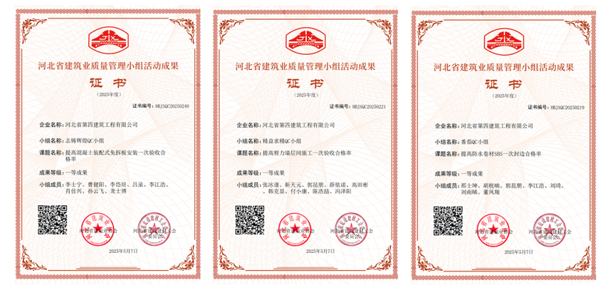 5月15日,七分公司申報(bào)的“提高防水卷材SBS一次封邊合格率”“提高剪力墻層間施工一次驗(yàn)收合格率”“提高混凝土裝配式免拆板安裝一次驗(yàn)收合格率”三項(xiàng)QC成果,被河北省建筑業(yè)協(xié)會(huì)評(píng)為“一等成果”。這不僅是河北省建筑業(yè)協(xié)會(huì)對(duì)分公司技術(shù)創(chuàng)新能力的高度認(rèn)可,更是分公司扎實(shí)開展QC小組活動(dòng)、有效攻克施工難題、提升項(xiàng)目施工質(zhì)量的生動(dòng)寫照。
